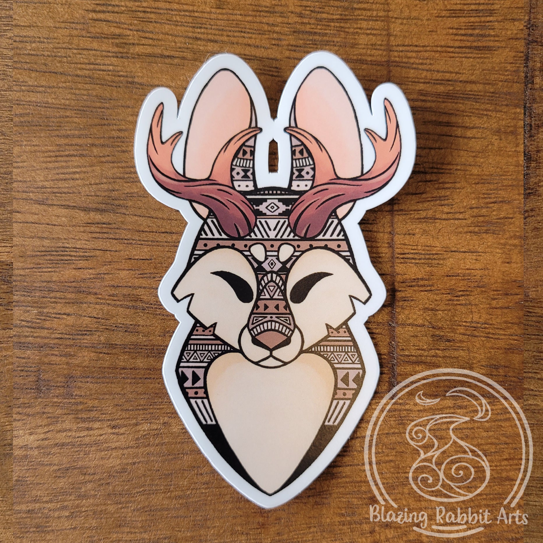 Matt laminated paper sticker of a Jackalope, size around 9 x 5 cm.
