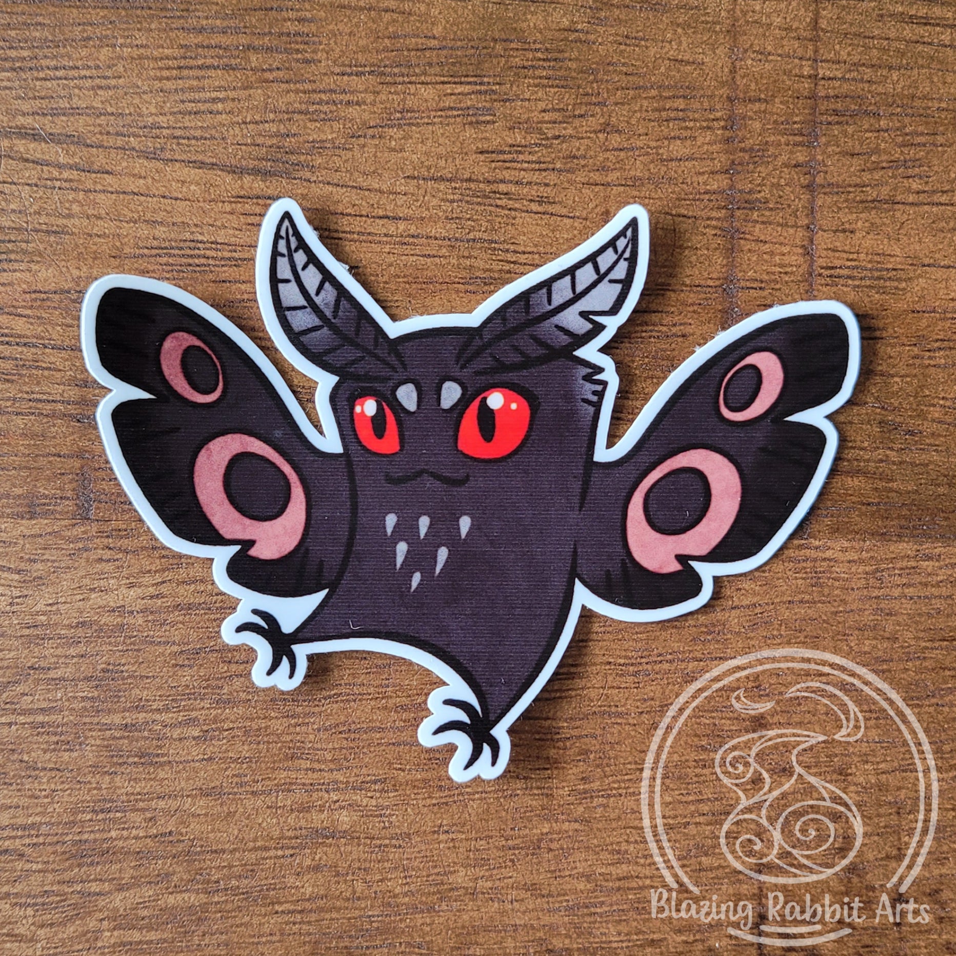 Matt laminated paper sticker of a Mothman, size around 8 x 6 cm.