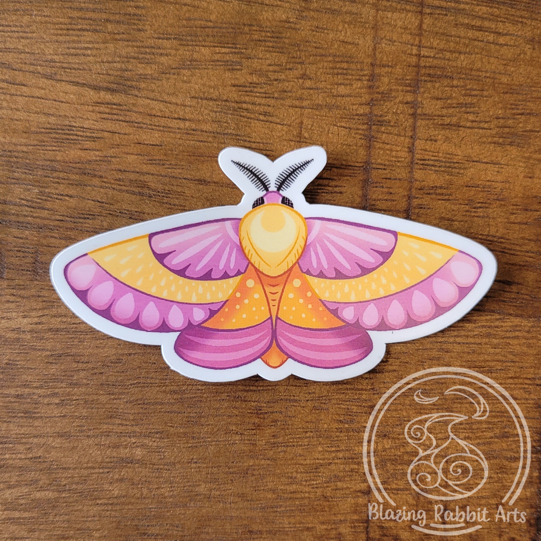 Matt laminated paper sticker of a Rosy Maple Moth, size around 9 x 5 cm.